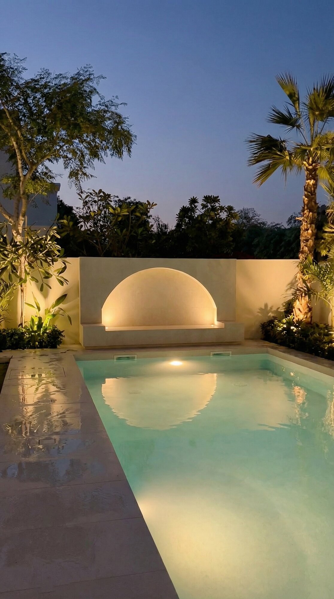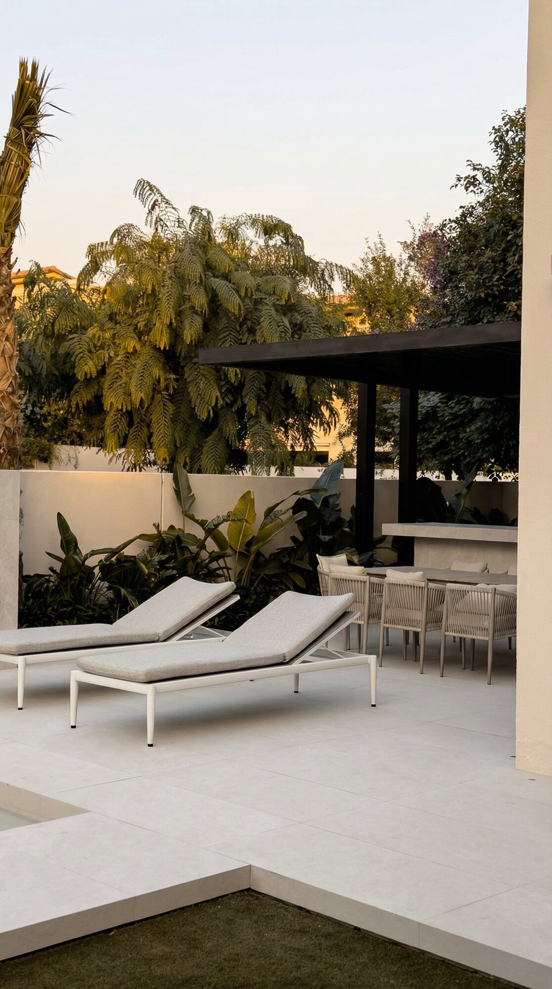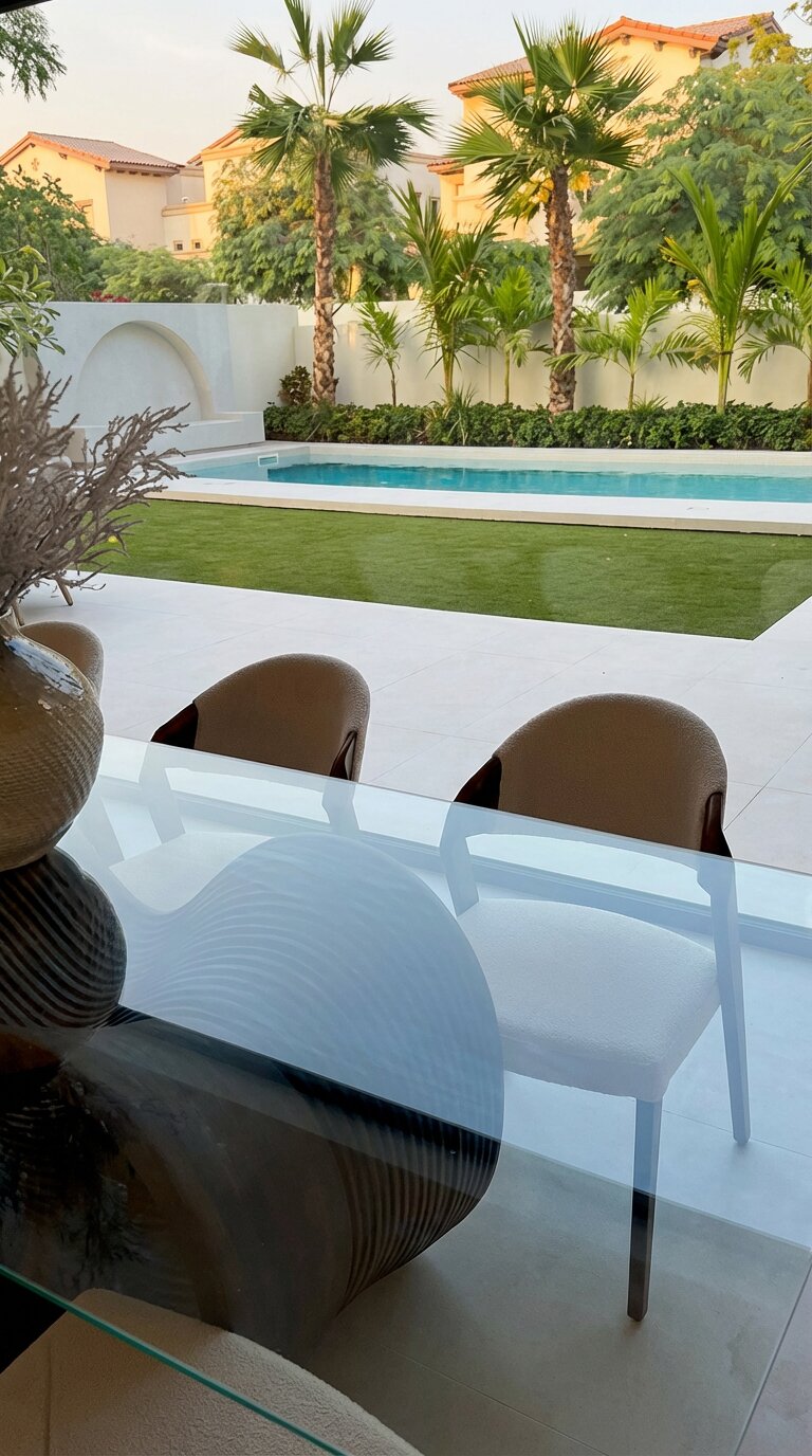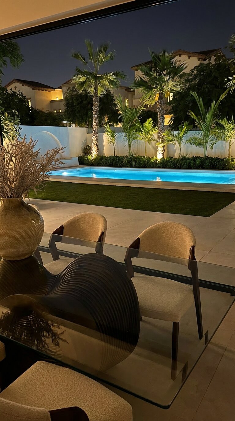 The exterior of Villa Sirena is an extension of its interior soul, transformed into a private resort-style retreat. The landscape design utilizes clean stone surfaces and lush greenery to frame a designer swimming pool and sunken lounge areas. Strategic architectural lighting creates a dramatic nighttime ambiance, highlighting the villa’s facade and outdoor features. By blurring the lines between indoor and outdoor zones, the project creates a holistic living experience where the desert sky and manicured gardens become an integral part of the home’s daily atmosphere.