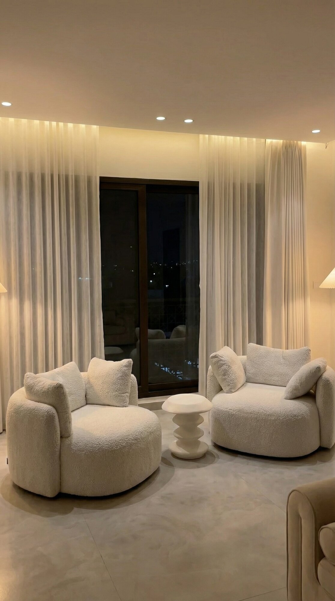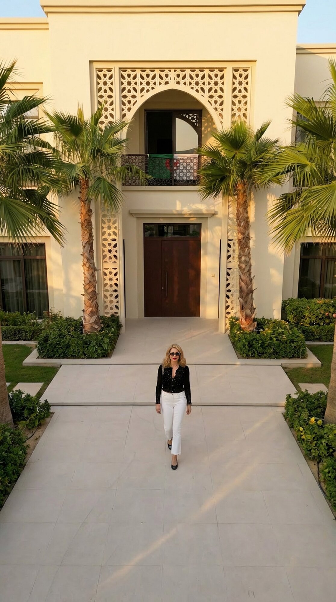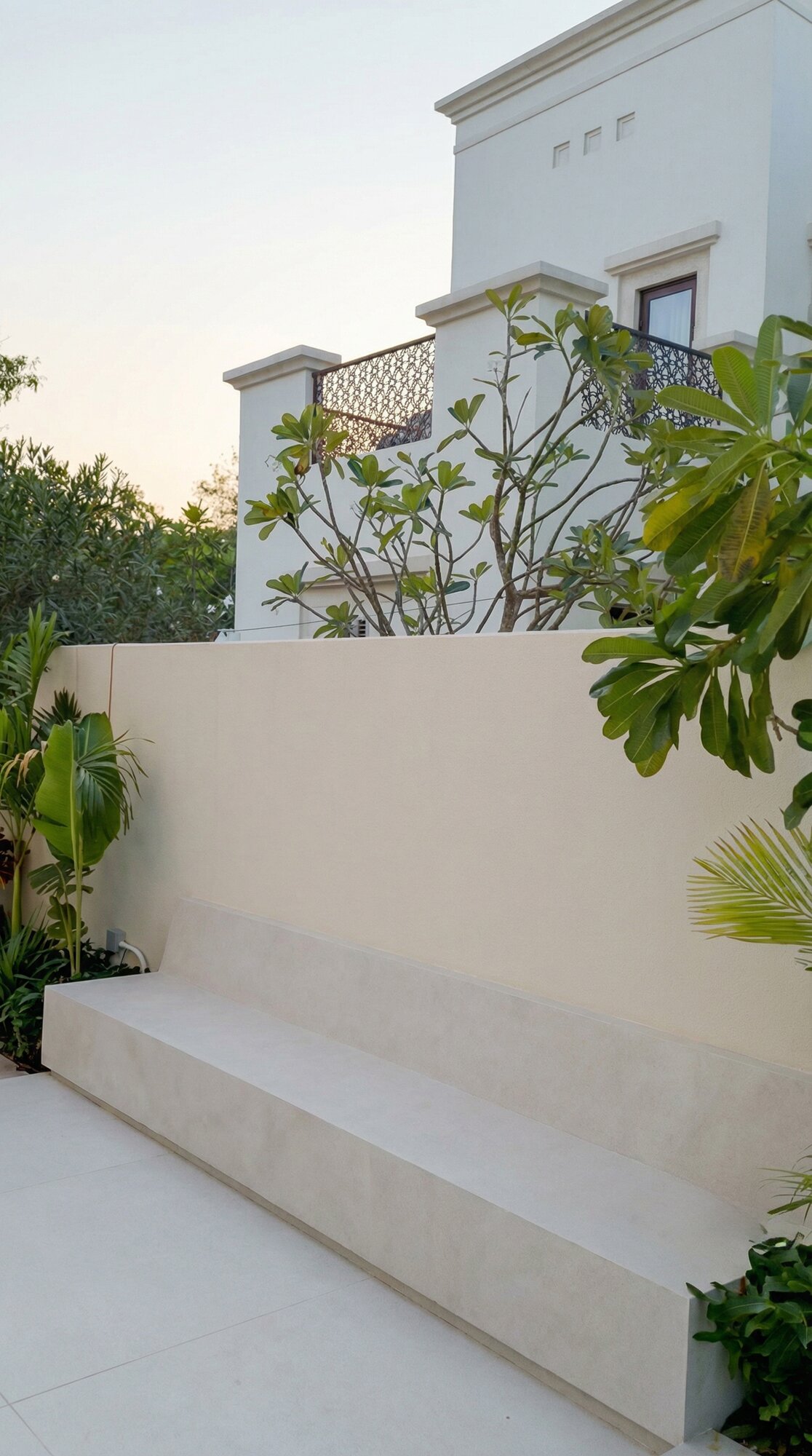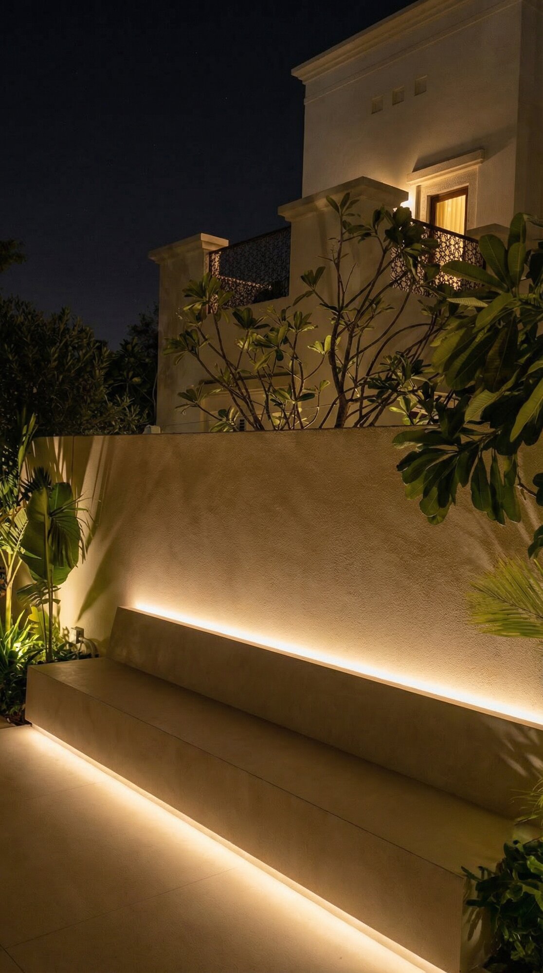 The exterior of Villa Sirena is an extension of its interior soul, transformed into a private resort-style retreat. The landscape design utilizes clean stone surfaces and lush greenery to frame a designer swimming pool and sunken lounge areas. Strategic architectural lighting creates a dramatic nighttime ambiance, highlighting the villa’s facade and outdoor features. By blurring the lines between indoor and outdoor zones, the project creates a holistic living experience where the desert sky and manicured gardens become an integral part of the home’s daily atmosphere.