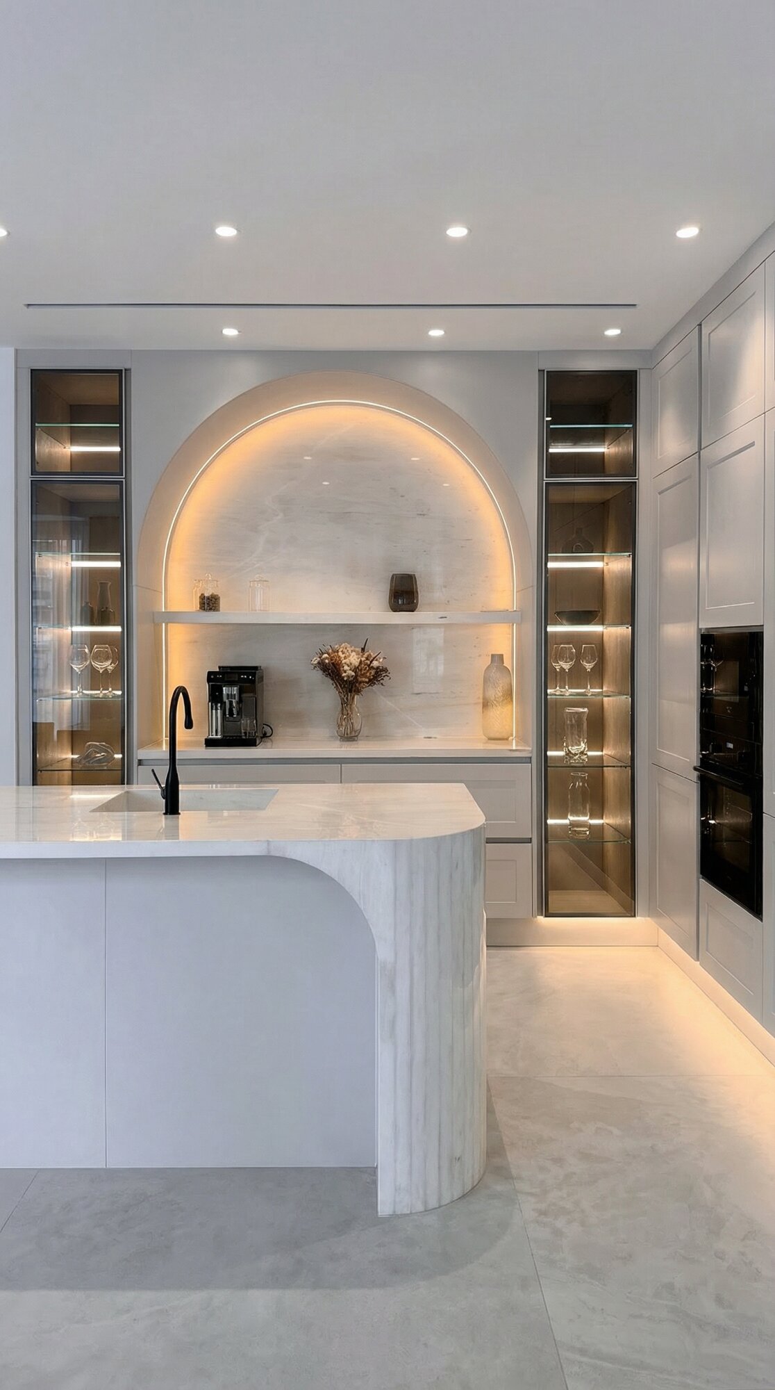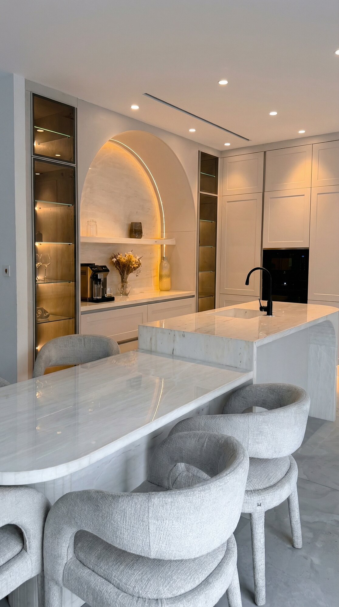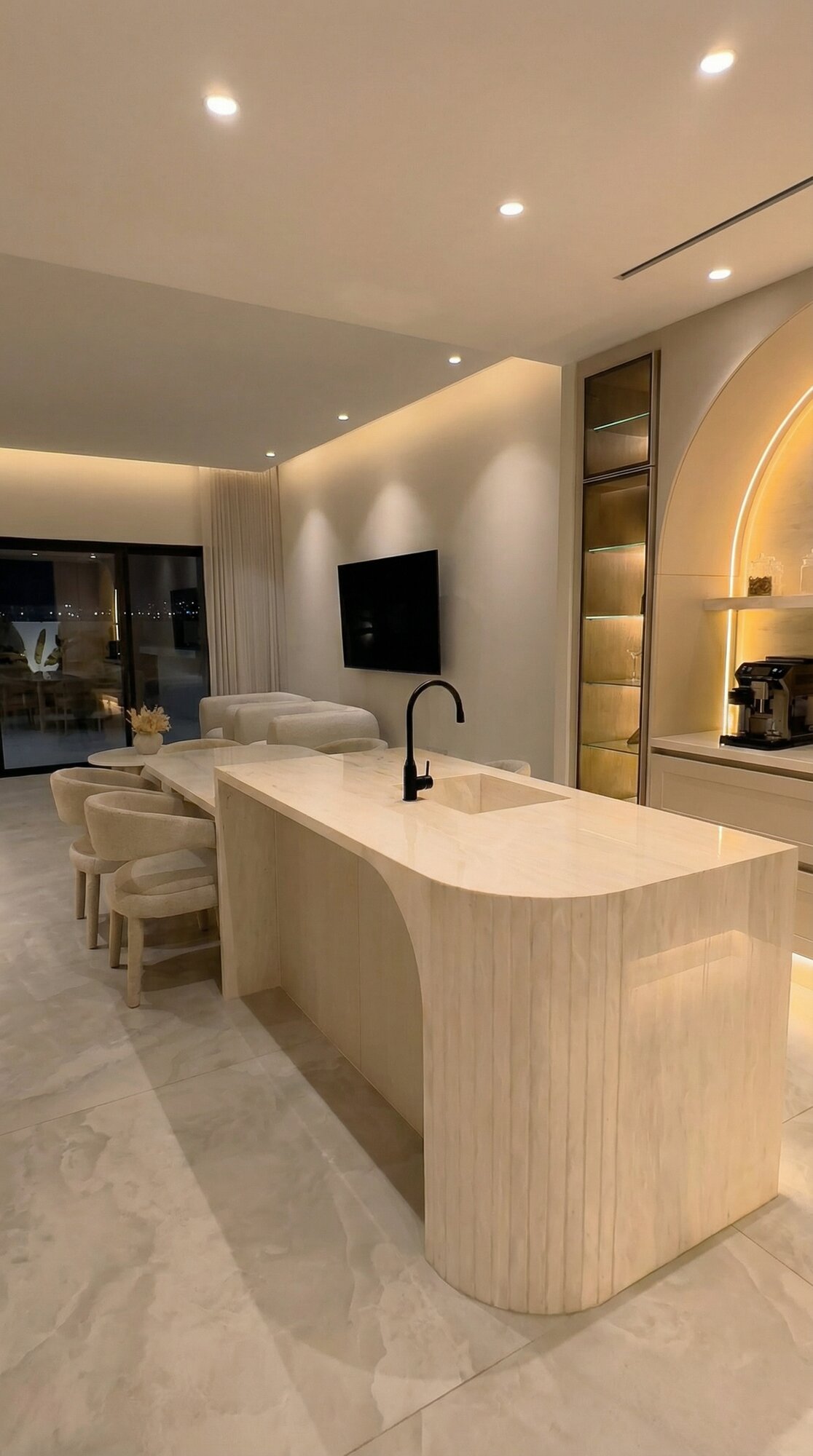 The interior narrative of Villa Sirena is defined by a sense of fluid continuity and tactile luxury. Moving away from traditional opulence, the design embraces “quiet luxury” through soft neutral tones and the extensive use of natural stone, such as honed travertine and marble. Architectural boundaries are softened by curved bespoke joinery and sculptural furniture forms that create a sense of visual harmony. Every detail, from the textured wall finishes to the custom-integrated lighting, has been meticulously crafted to highlight the home’s unique geometry, ensuring the spaces feel composed and deeply personal.